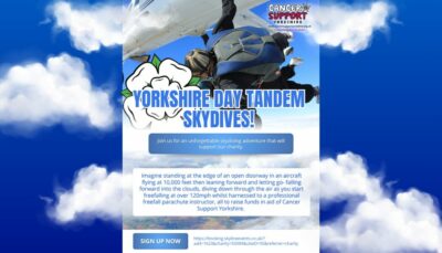 Imagine standing at the edge of an open doorway in an aircraft flying at 10,000 feet then leaning forward and letting go – falling forward into the clouds, diving down through the air as you start freefalling at over 120mph whilst harnessed to a professional freefall parachute instructor, all to raise funds in aid of Cancer Support Yorkshire.